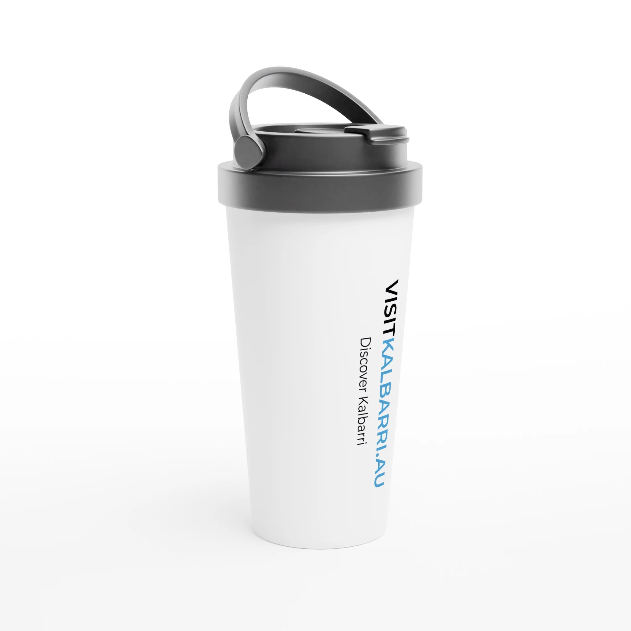 Our Visit Kalbarri stainless steel travel mug features a clean, vertical VISITKALBARRI.AU design with the subtle tagline Discover Kalbarri — simple, modern, and inspired by Australia’s Coral Coast.